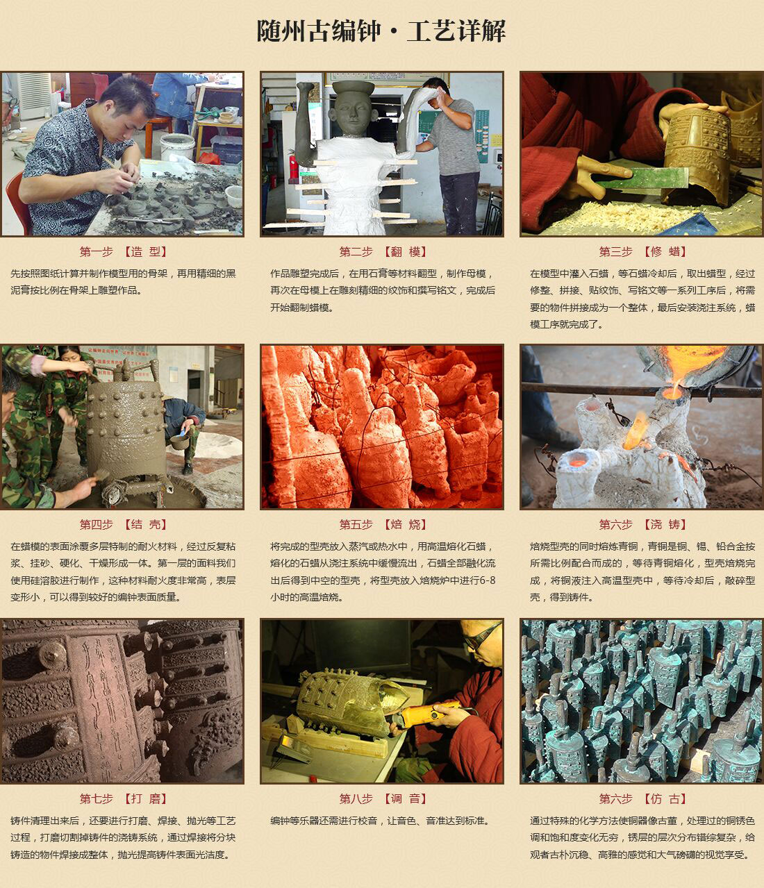 隨州市古編鐘精密鑄造廠是古編鐘公司旗下的基礎(chǔ)核心部門,工廠主要負責(zé)產(chǎn)品的設(shè)計和研發(fā)、生產(chǎn)、檢驗、包裝、物流配送等工作,工廠現(xiàn)有職工25人,其中仿古工藝技術(shù)人員8人,擁有固定資產(chǎn)原值400萬元,占地面積11000平方米,各種設(shè)備92臺(套)。工廠實行6S管理理念,從產(chǎn)品的設(shè)計研發(fā)到制作包裝出廠,均由專業(yè)人士實施質(zhì)量檢測,力爭做到每一件都是至上精品,每一件都是純正國寶。